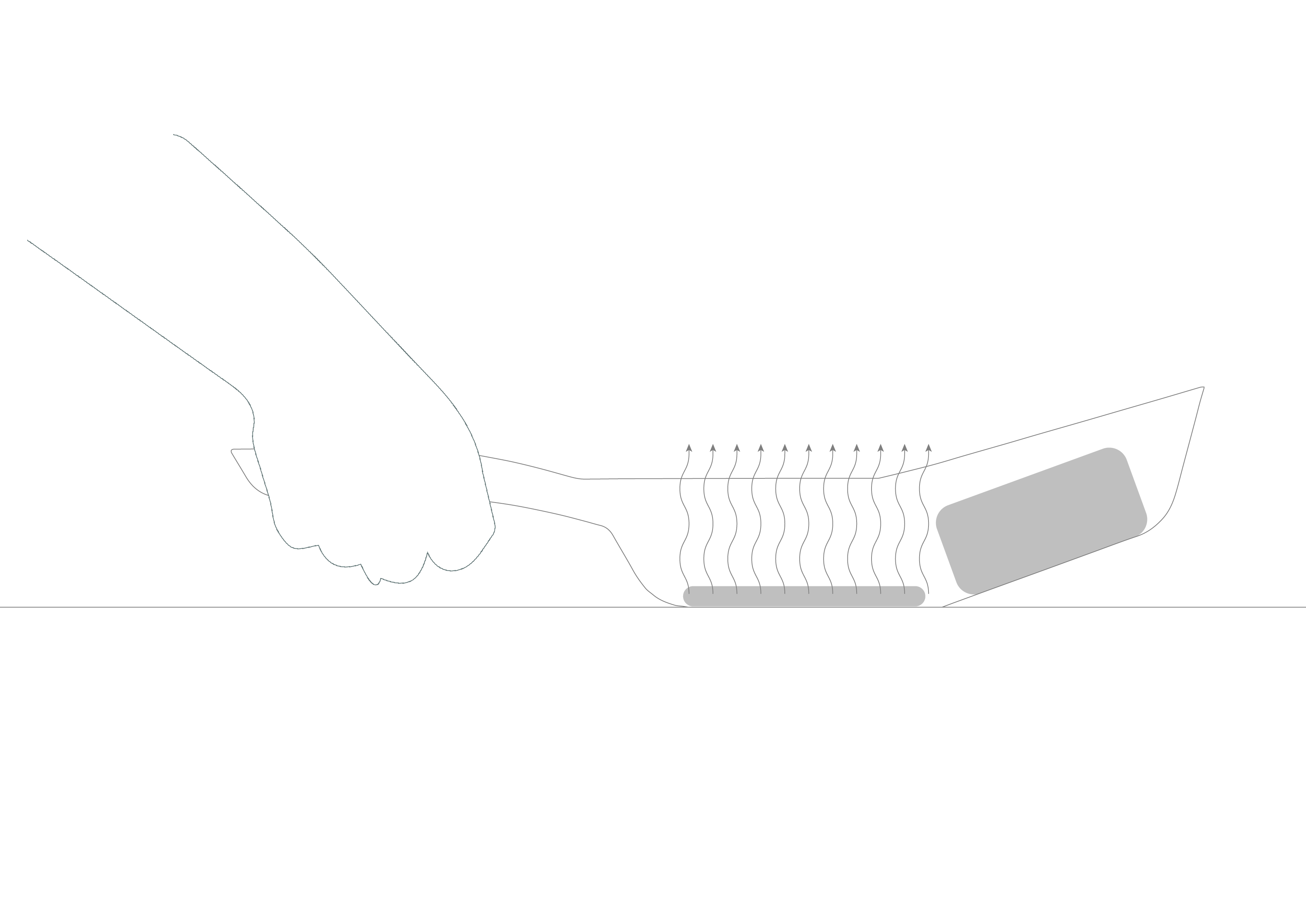 Der simple kleine Knick in dieser Pfanne erzeugt nicht nur eine interessante Ästhetik, sondern ermöglicht auch ein neues Verhalten beim Kochen. Beispielsweise bei Fisch- und Fleischgerichten, die gebraten werden und nebenbei eine Soße oder andere Vorbereitungen benötigen, kann man die Hauptzutaten auf die vordere Seite verschieben und sich parallel mit den Anderen beschäftigen, ohne die Wärme. Dementsprechend passt mein Entwurf besonders zum modernen Lebensstil, in dem man oft nur wenig Zeit und Raum zur Verfügung hat. Die Struktur am Boden der Pfanne bewirkt.